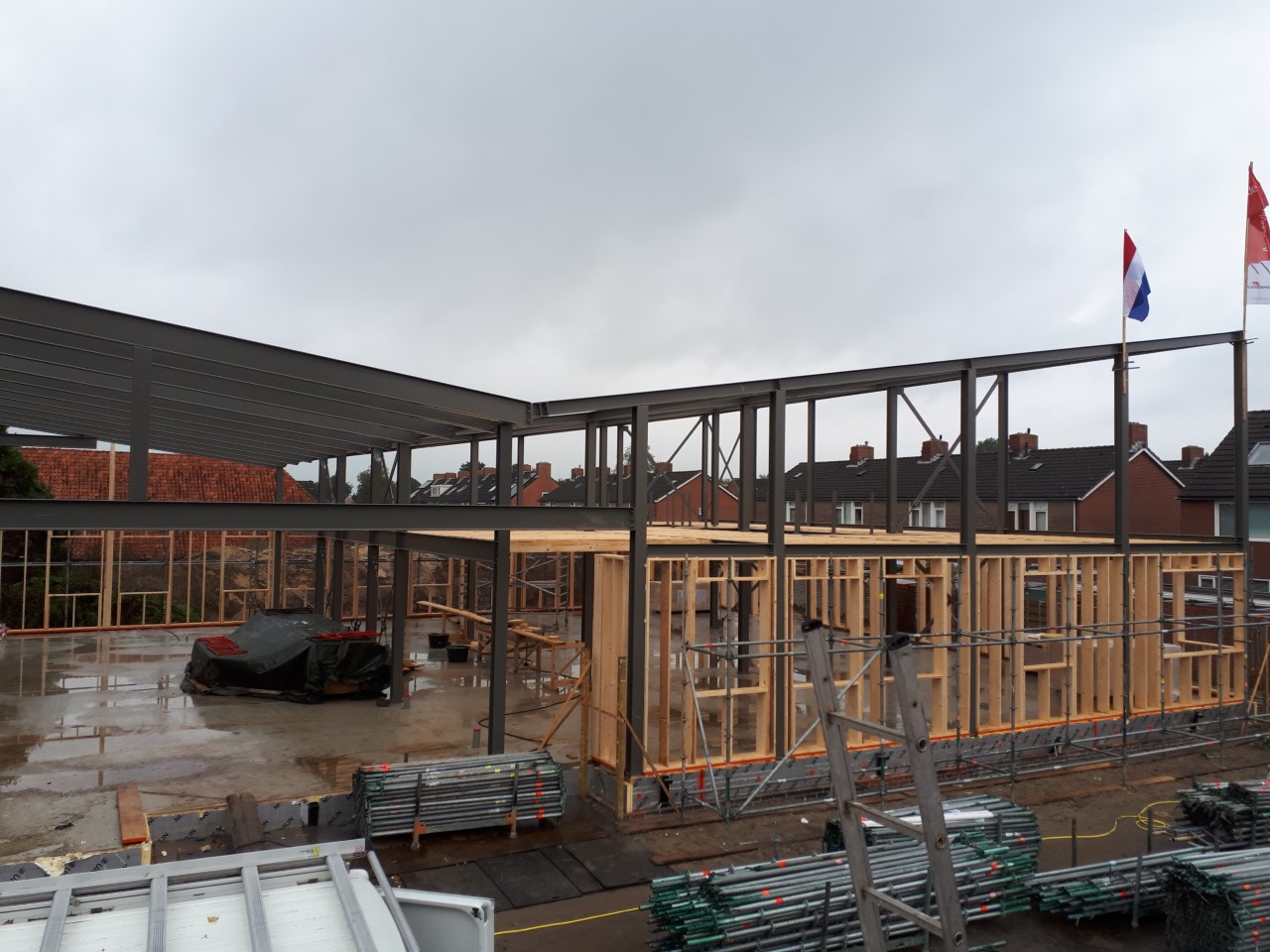 Een week na de bouwvakvakantie is begonnen met het plaatsen van de staalconstructie voor de nieuwbouw. Dit verliep volgens planning. Op de eerste ochtend kon al de eerste vrachtauto met de stalen onderdelen worden gelost. Binnen een paar dagen werd al zichtbaar hoe de nieuwbouw er grofweg uit komt te zien. Inmiddels zijn de werkzaamheden zover gevorderd dat in week 38 de dakplaten kunnen worden gelegd zodat de vorm en het uiterlijk van het gebouw nog zichtbaarder worden. Dit betekent ook dat de bouwers minder afhankelijk zullen zijn van het weer.